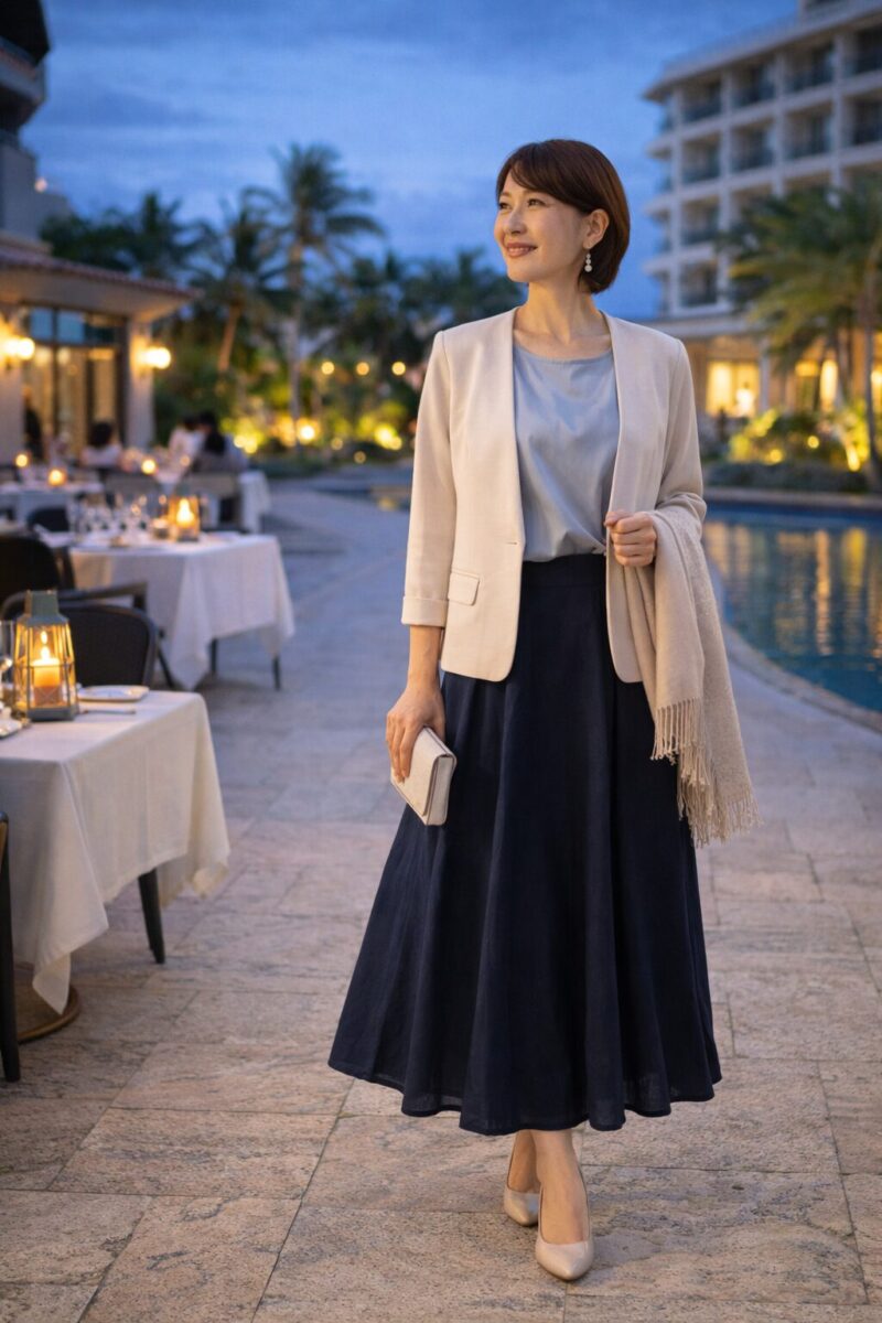 派手すぎず「大人の余裕」を感じるコーデが、写真でも素敵に映ります。