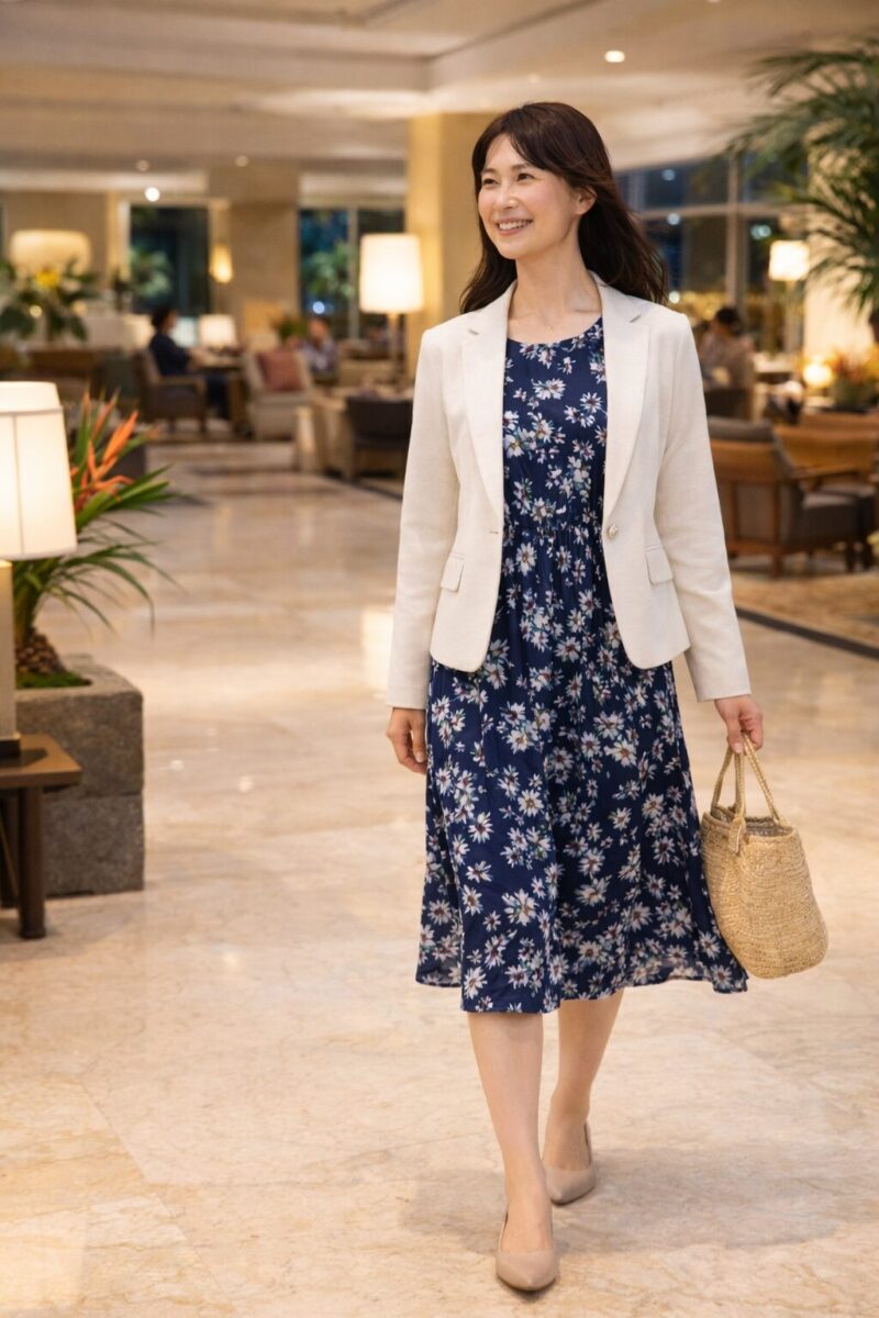 動きやすく、体型カバーもしやすいため、ミドル世代の旅行コーデに特に適しています。